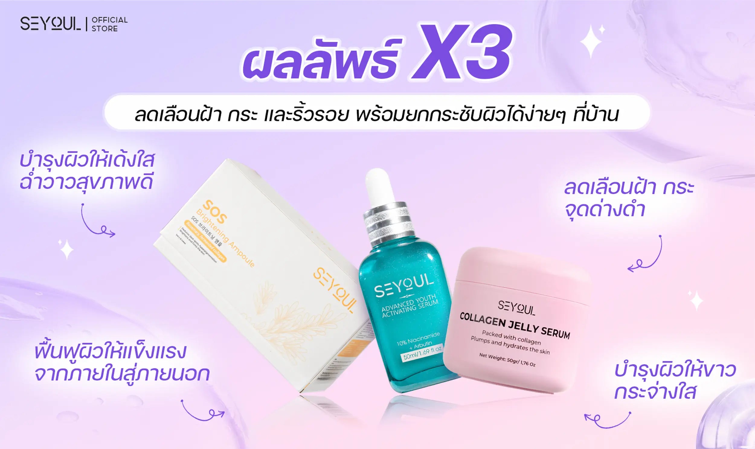 คอมโบ Triple Serum Seyoul เป็นเซรั่ม 3 ขวดที่ออกแบบตามลำดับขั้นตอน: รักษาต้นตอ – ปรับผิวให้กระจ่างใส – ล็อกความชุ่มชื้น